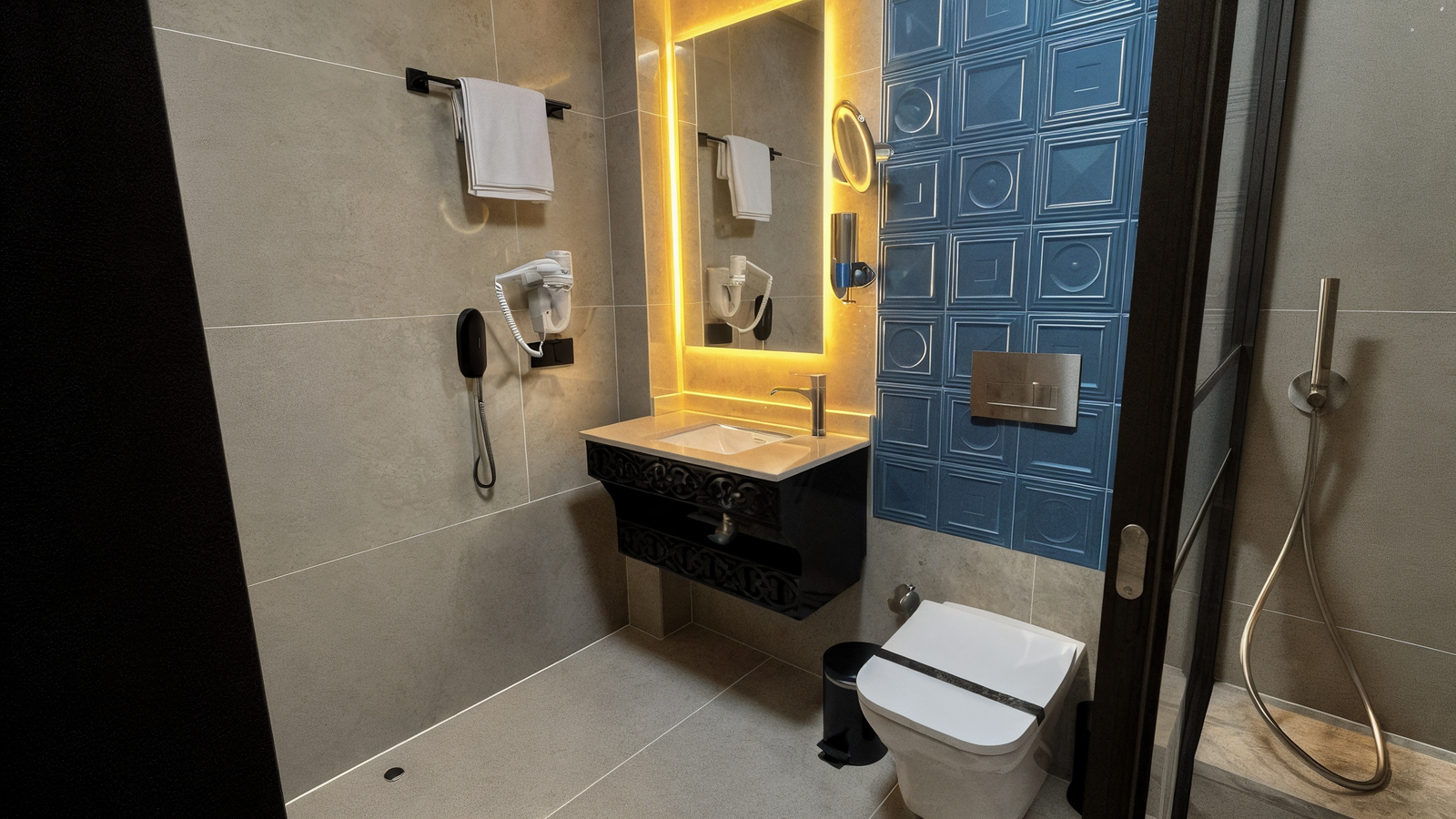 Hamam Taşıyla Donatılmış Banyo: Türk hamamı esintisi taşıyan özel tasarım banyoda rahatlatıcı bir duş deneyimi.